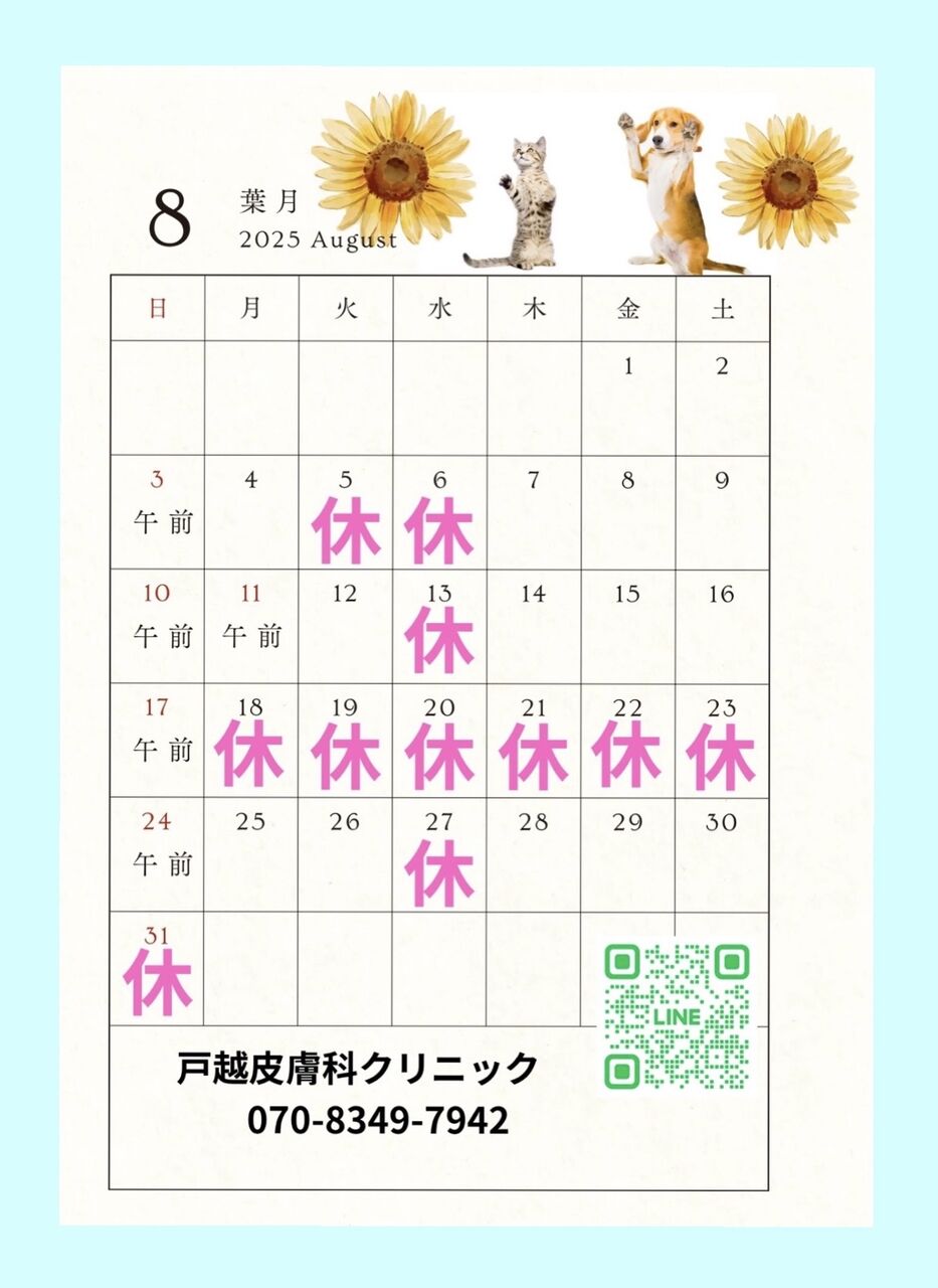 全ての水曜日と27日以外の日曜日、8日(火)、28日(月)が休診日となります。