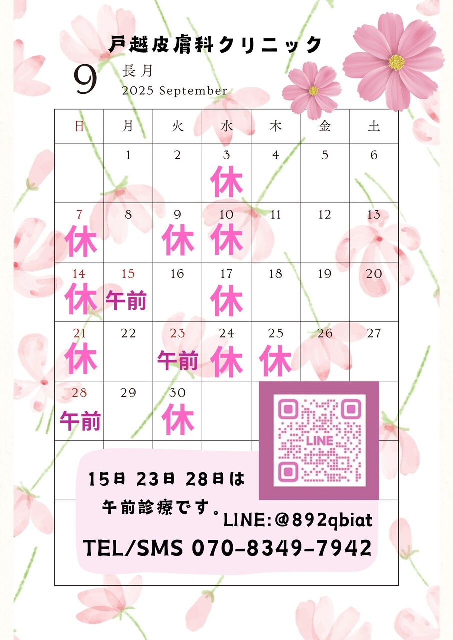9月1日(日)、4日(水)、5日(木)、8日(日)、11日(水)、15日(日)、18日(水)、20日(金)、24日(火)、25日(水)、26日(木)、29日(日)は、休診とさせていただきます。