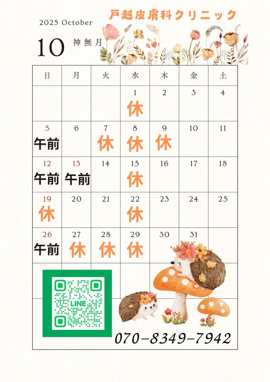 10月2日(水)、7日(月)、8日(火)、9日(水)、13日(日)、16日(水)、23日(水)、24日(木)、29日(火)、30日(水)は、休診とさせていただきます。